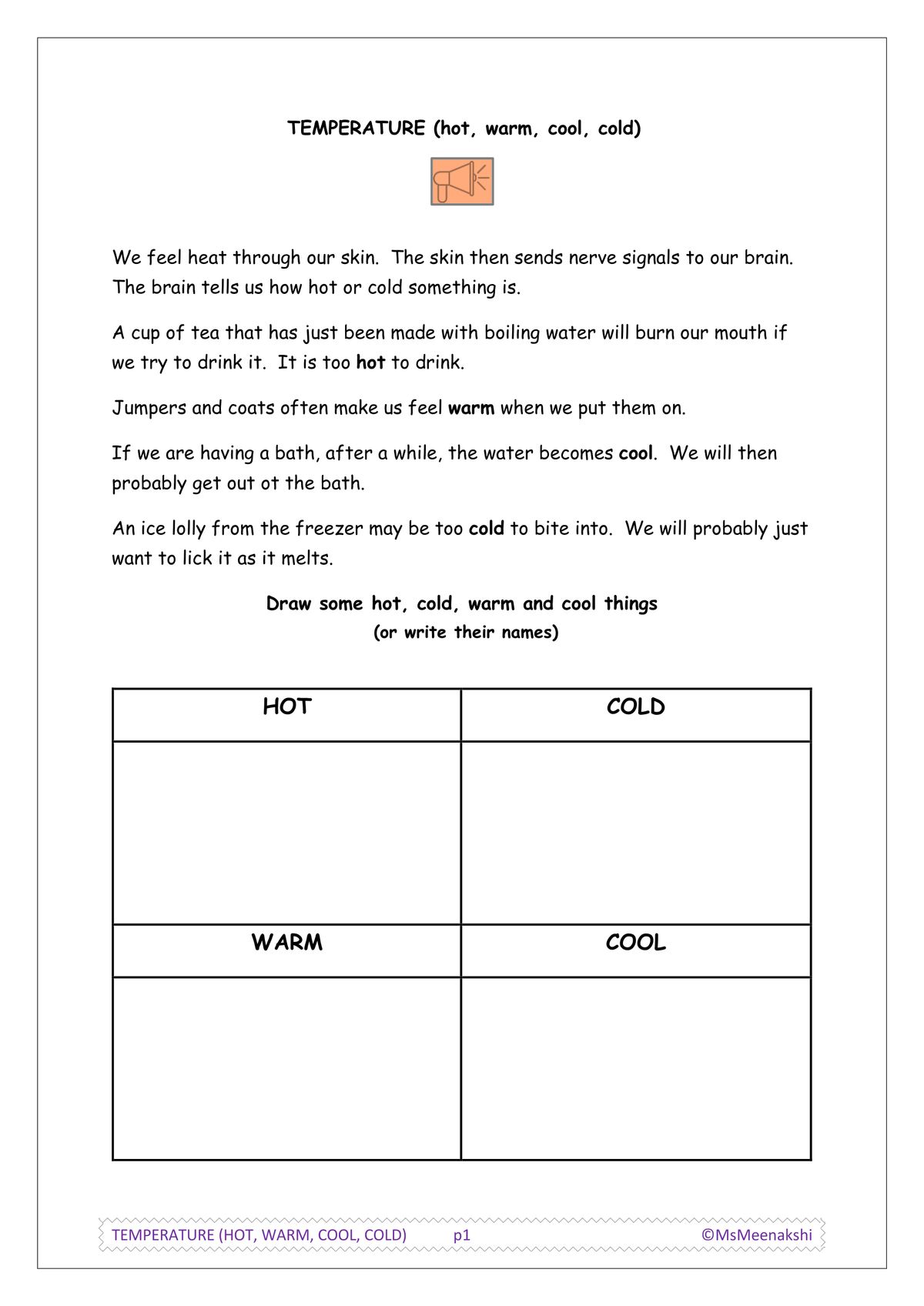 It gives examples of things that are hot, warm, cool and cold and children can draw/write their own examples