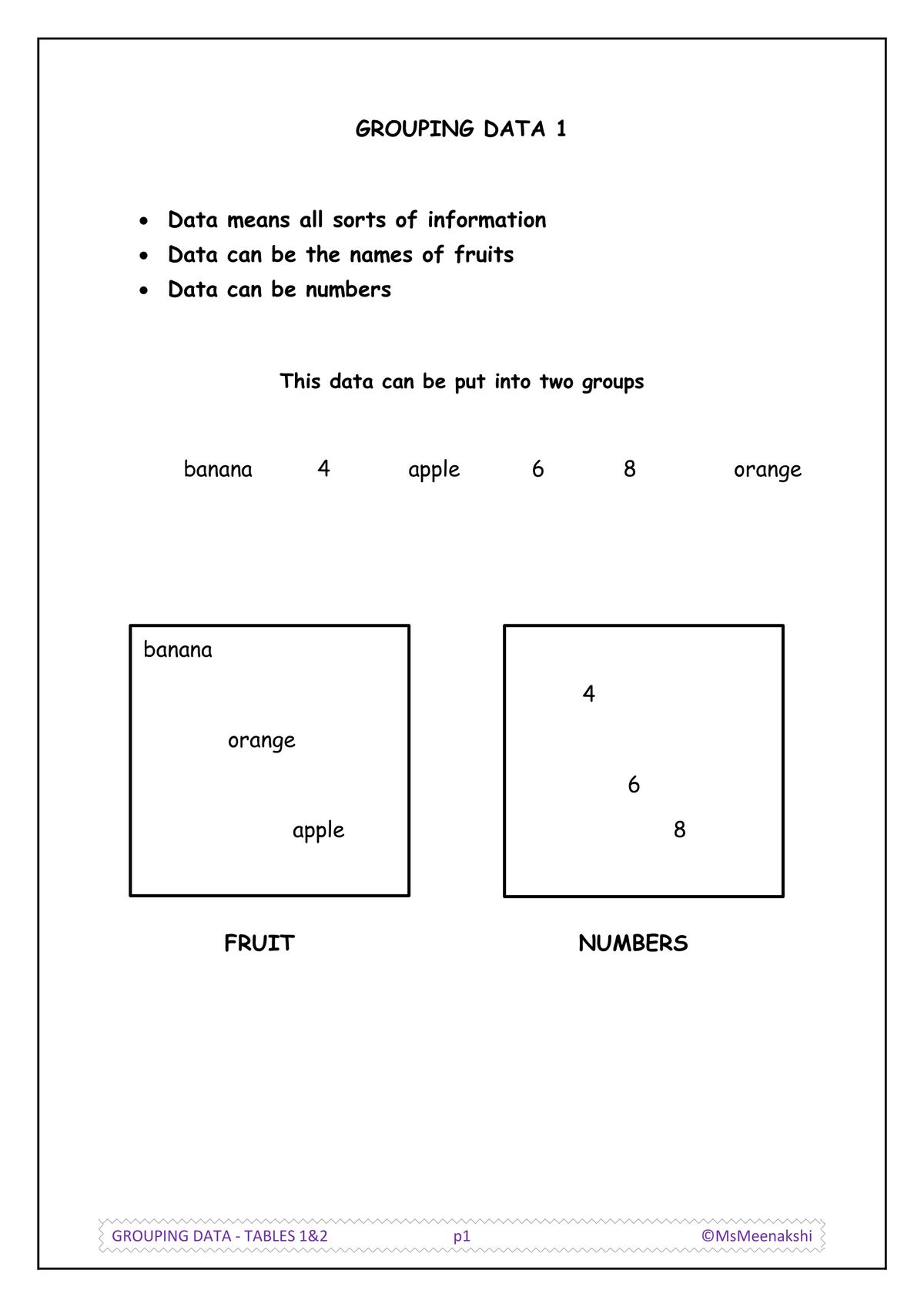 This resource of 6 pages introduces the concept of data, how it can be grouped and used in tables
