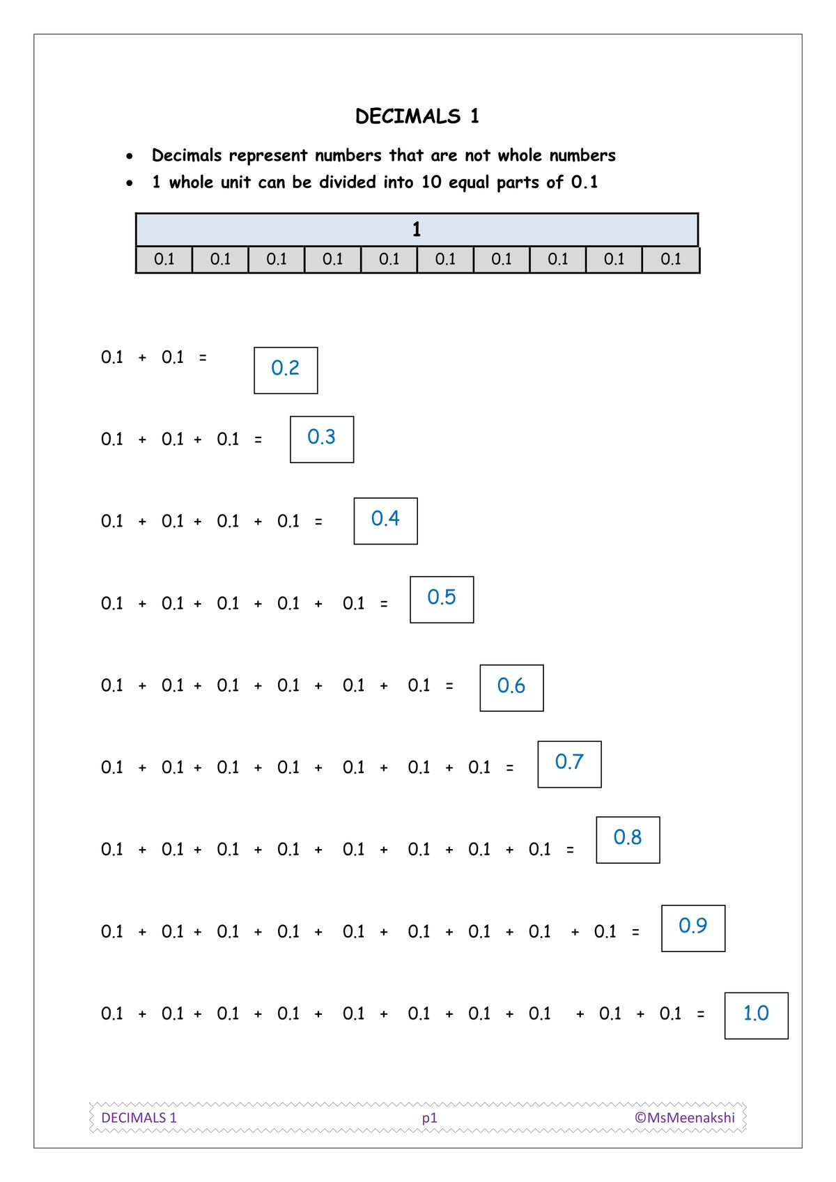 This resource pack of 2 pages has an addition activity to show how 1 whole unit can be made from 10 equal parts of 0.1