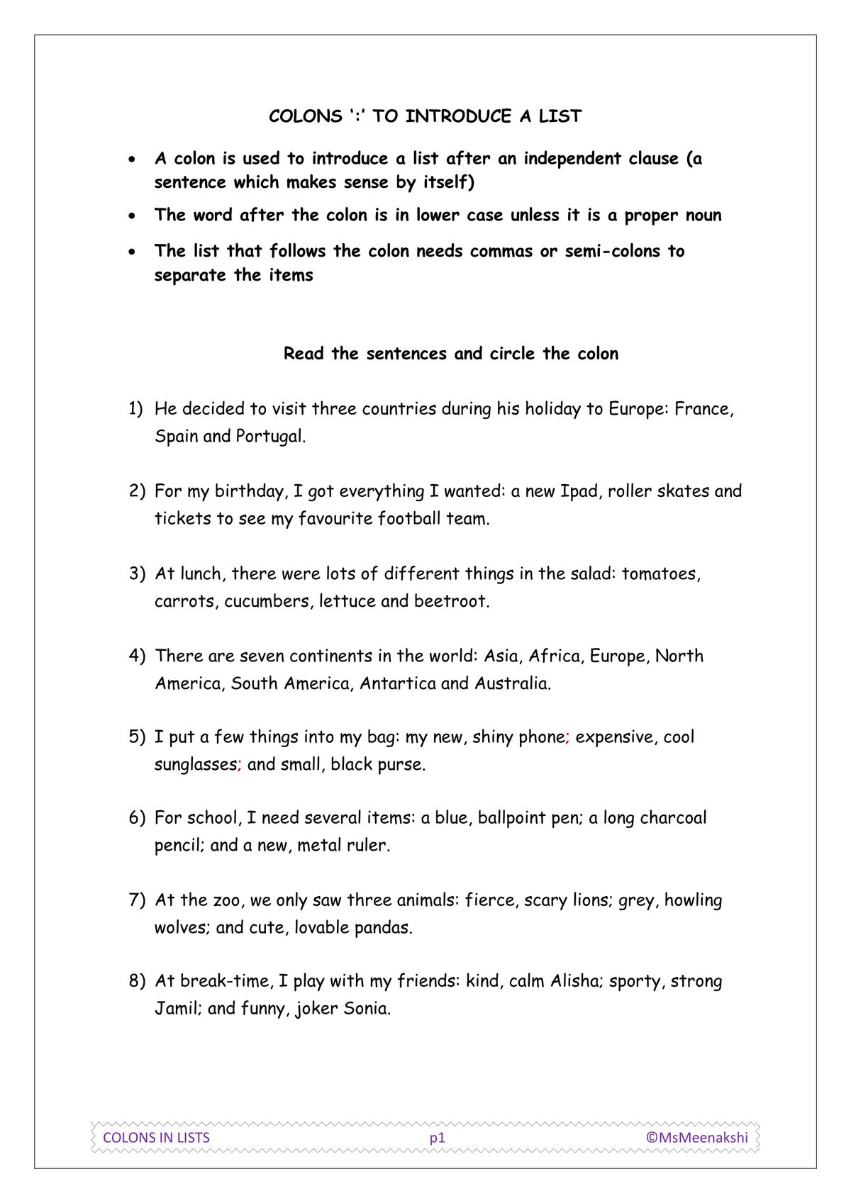 This resource pack of 10 pages covers identifying and using semi-colons in complicated lists within sentences